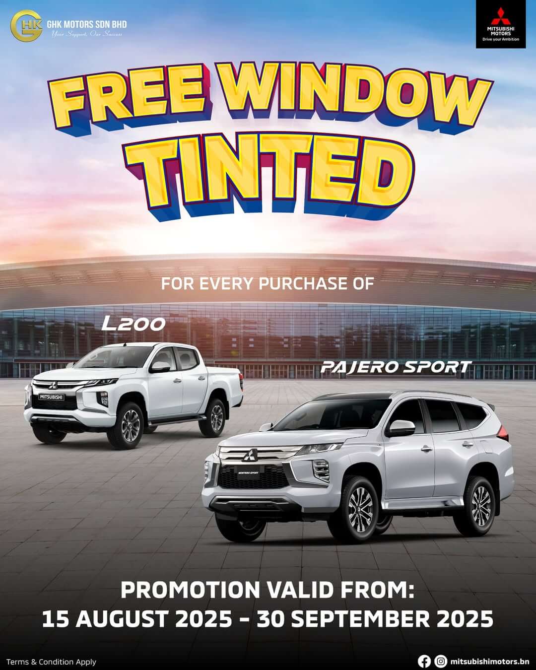 Every purchase of the Mitsubishi Pajero Sport or Mitsubishi L200 now comes with a FREE Window Tinted, giving you added protection from the heat while enhancing your style on the road. This exclusive offer is available from 15 August 2025 until 30 September 2025 visit our Mitsubishi showroom and make your drive even better today. Terms and Conditions Apply